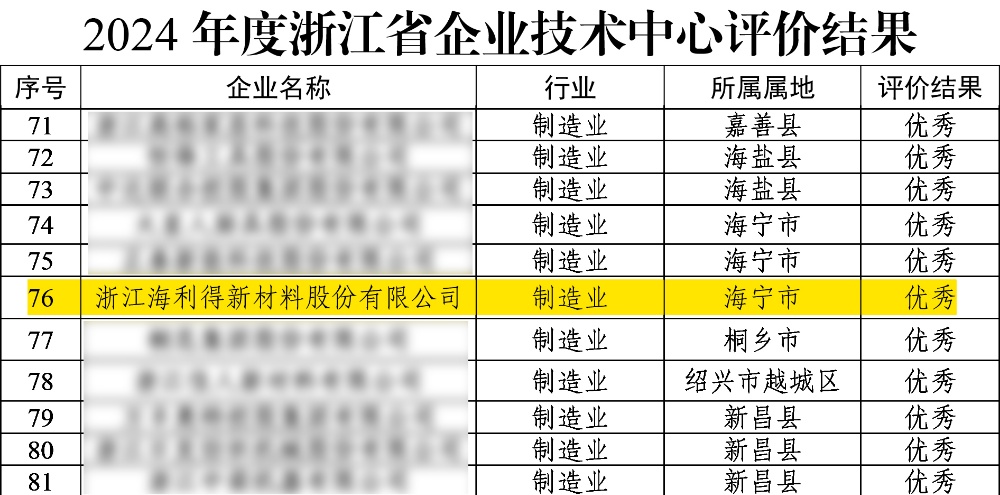 近日,浙江省經濟和信息化廳、浙江省財政廳、國家稅務總局浙江省稅務局和中華人民共和國杭州海關聯合公布了制造業領域2024年度浙江省企業技術中心評價結果,海利得順利通過復評,評級等級為優秀。